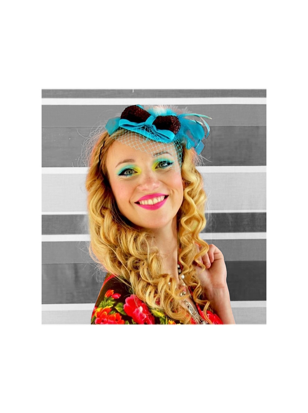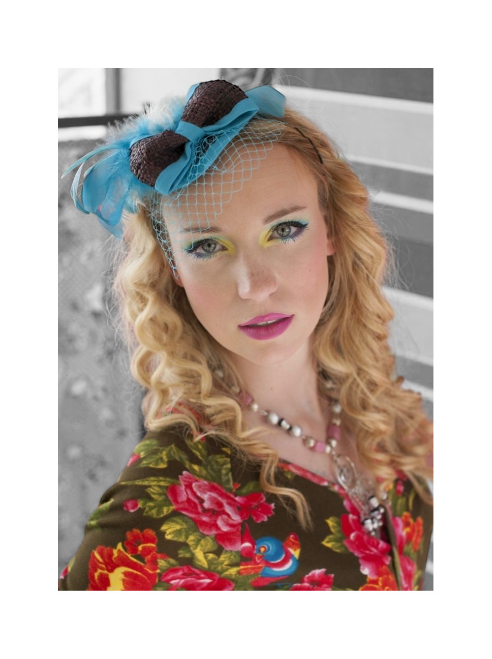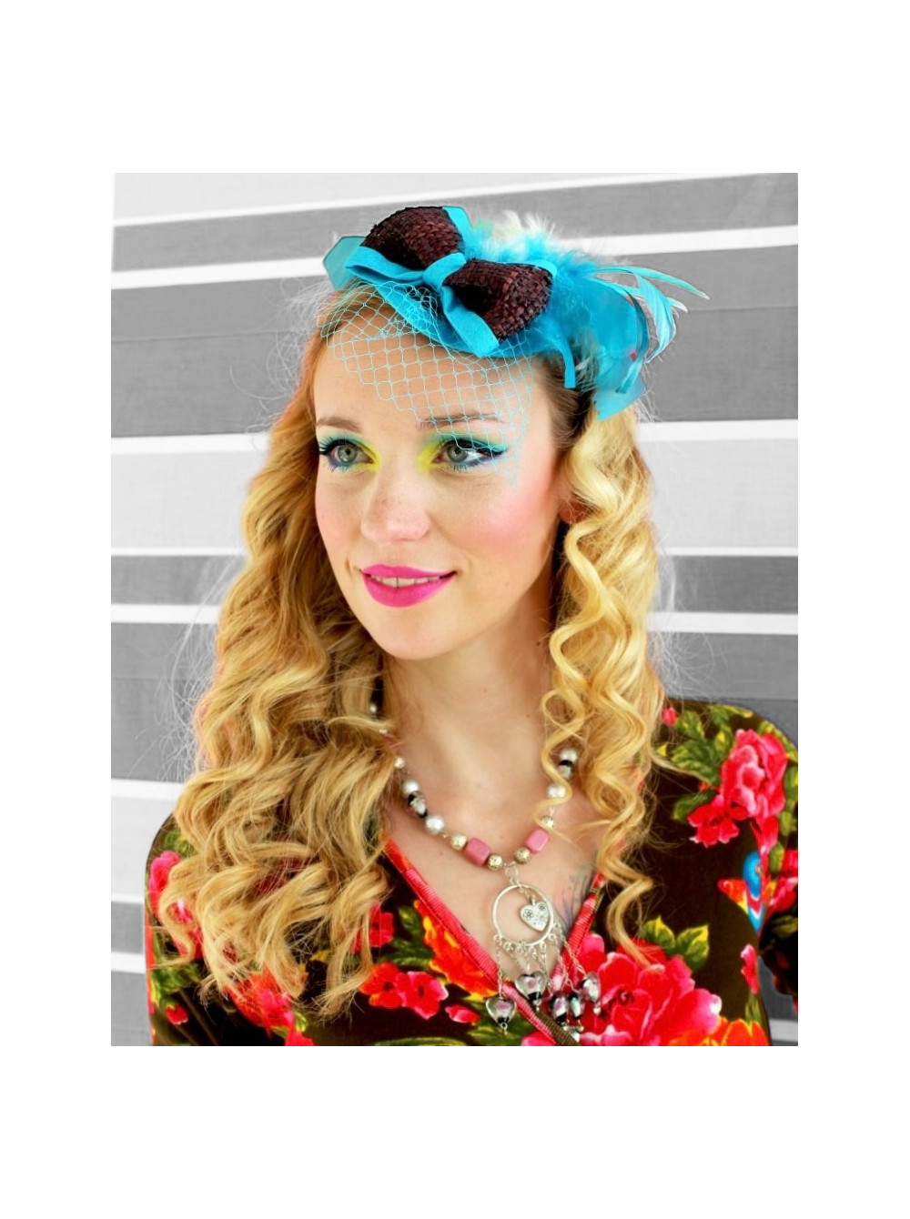 Et pourquoi ne pas insuffler un petit brin de fantaisie et de folie dans nos habitudes vestimentaires ? Revisitons nos envies, démarquons nous, sortons chapeautées ou plutôt "bibisées". Découvrez les bibis qui ont un format plus petit qu'un chapeau classique. Ce bibi est le fruit d’un travail artisanal et chaque modèle est unique. Il est réalisé en rabane, bordé d'un biais bleu turquoise et associé à des plumes. Il est monté sur un serre-tête pour rester confortablement en place et se dissimule dans votre chevelure qu’elle soit courte ou longue.