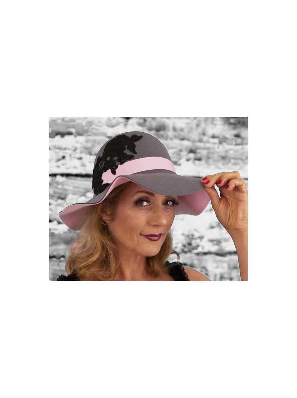 applique de dentelle noire d'un coté du chapeau