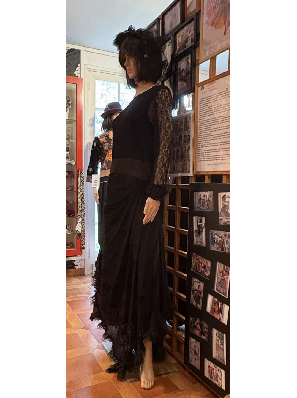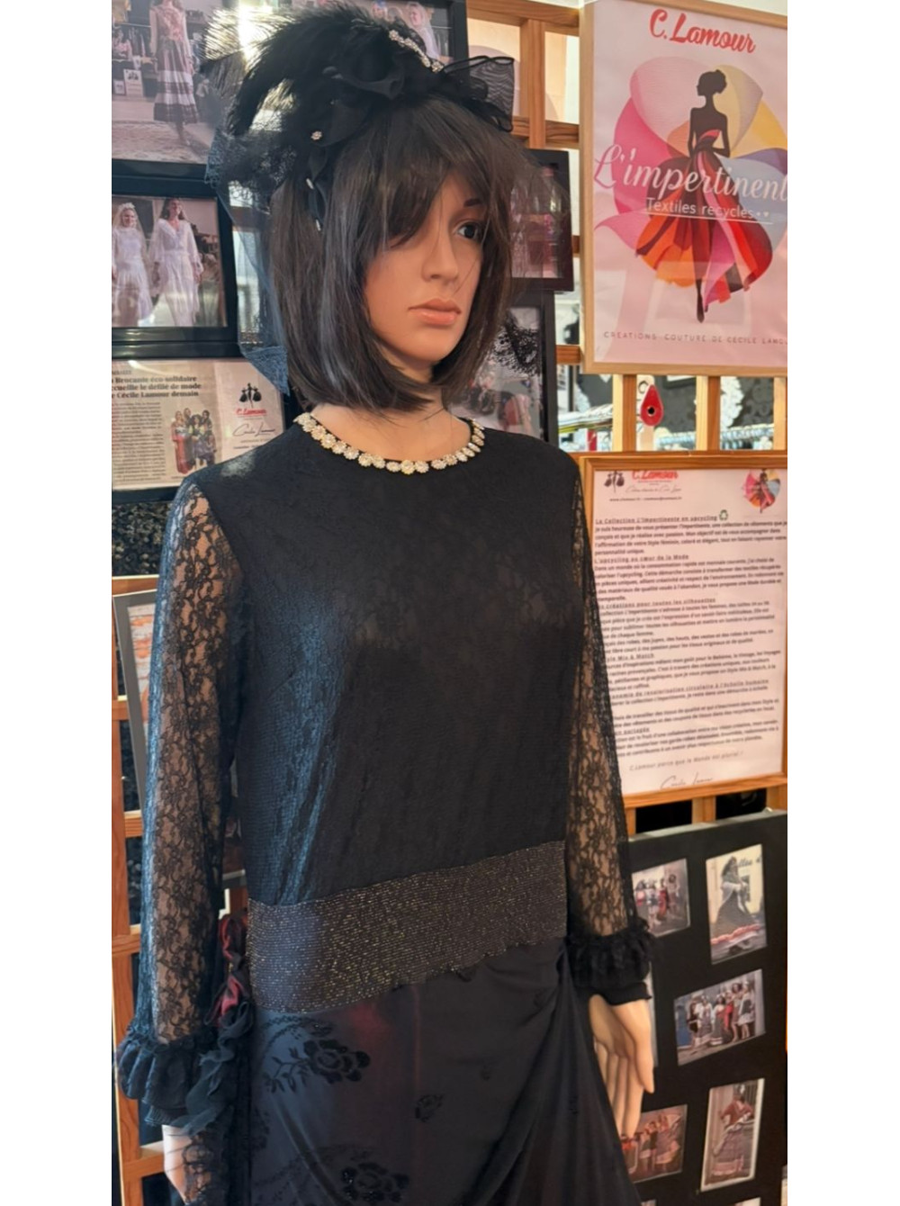 Une robe longue noire, où le taffetas prune, se laisse habiller par un jeu des dentelle noires. Le col est orné de strass couleur diamant.