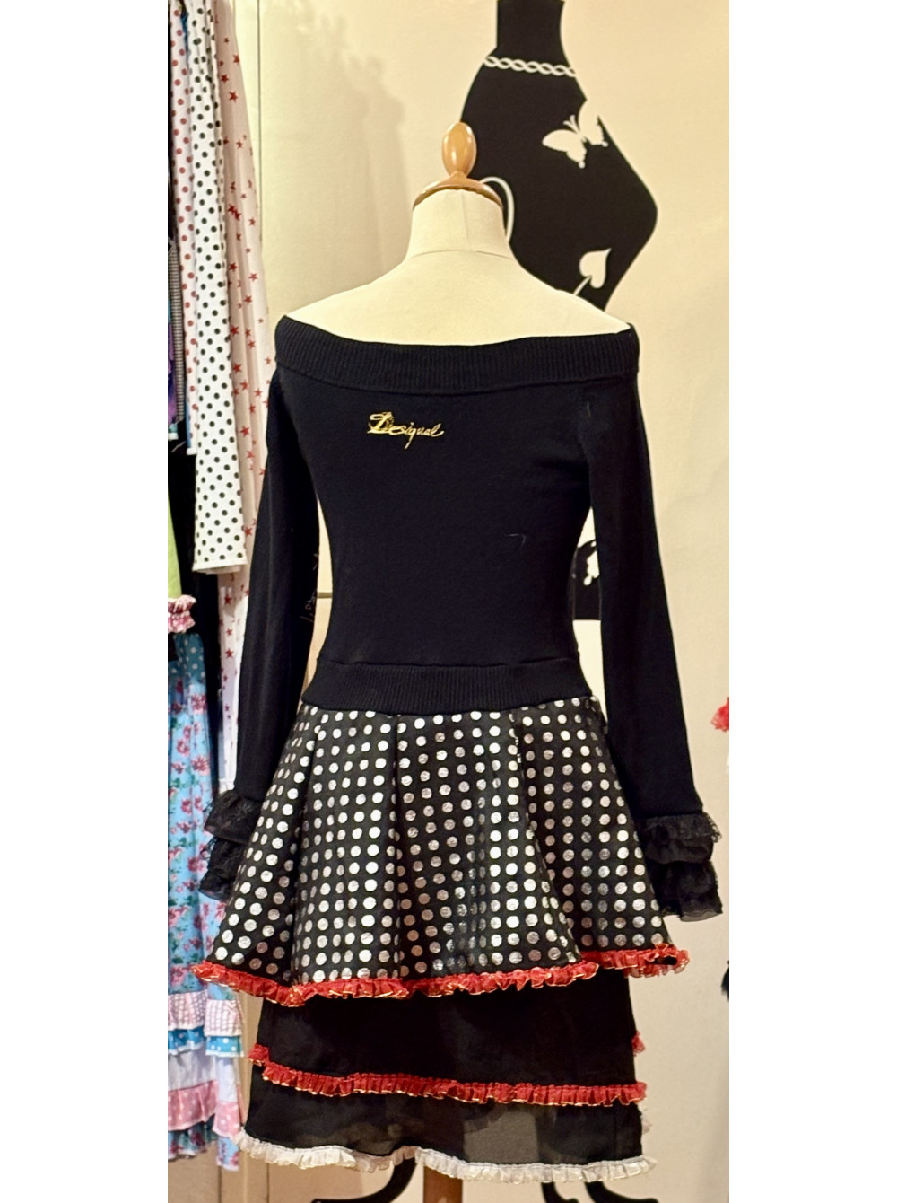 Le haut de la robe,est un pull qui provient d’une marque connue pour son esprit Mix & Match, un clin d’œil à une esthétique que je partage et réinvente.