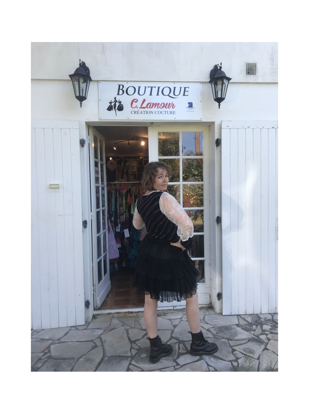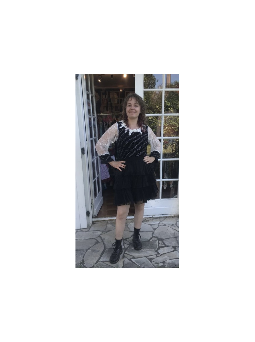 Robe de Soirée féminine à souhait avec des détails raffinés de dentelles et perles comme sur les manches et l'encolure. Le haut de la robe est en maille extensible dont le dessin est un quadrillage en losanges fuchsia rehaussé de paillettes sur font noir. Le bas de la robe en tissus satiné et velours a une belle ampleur.