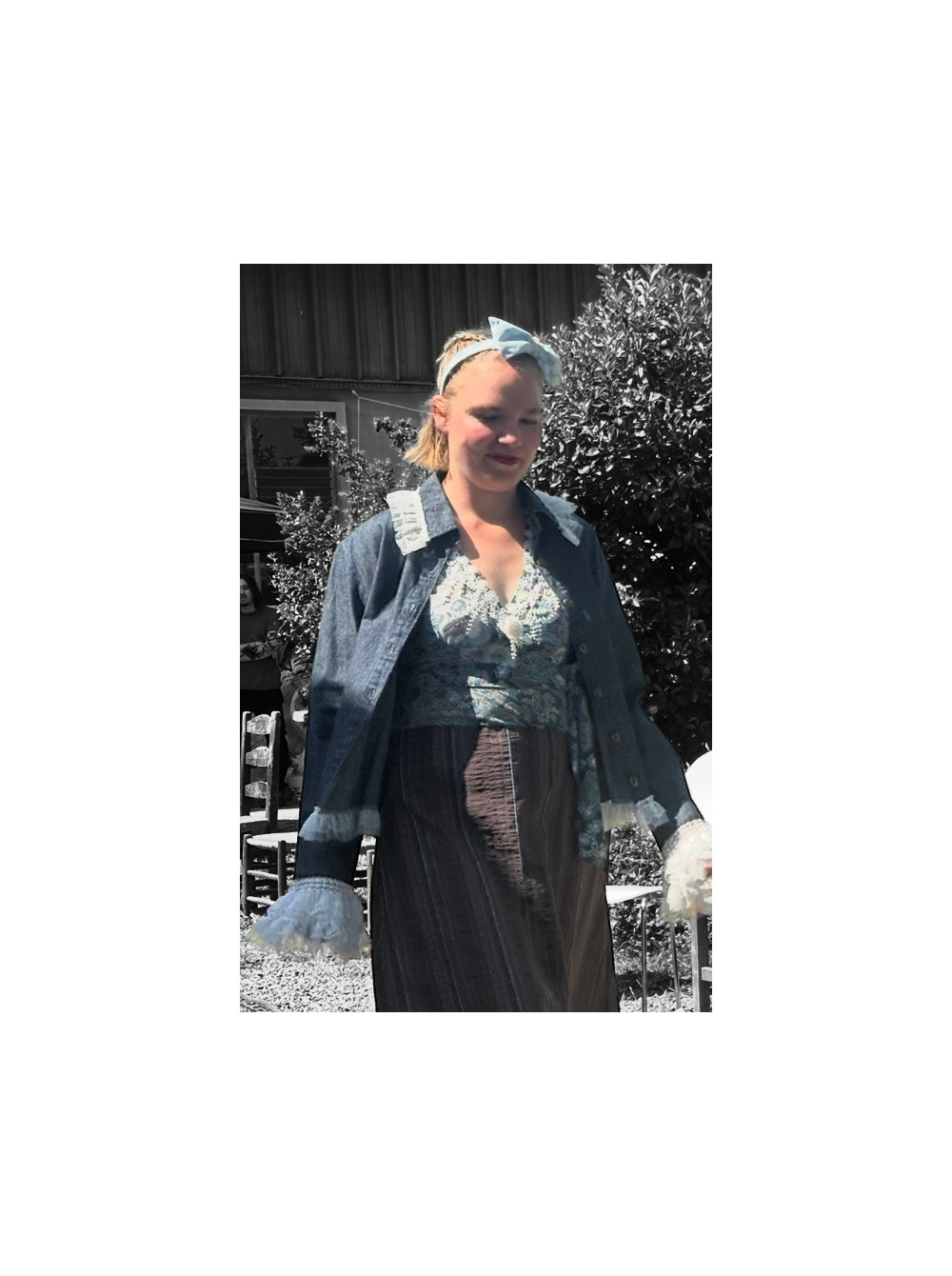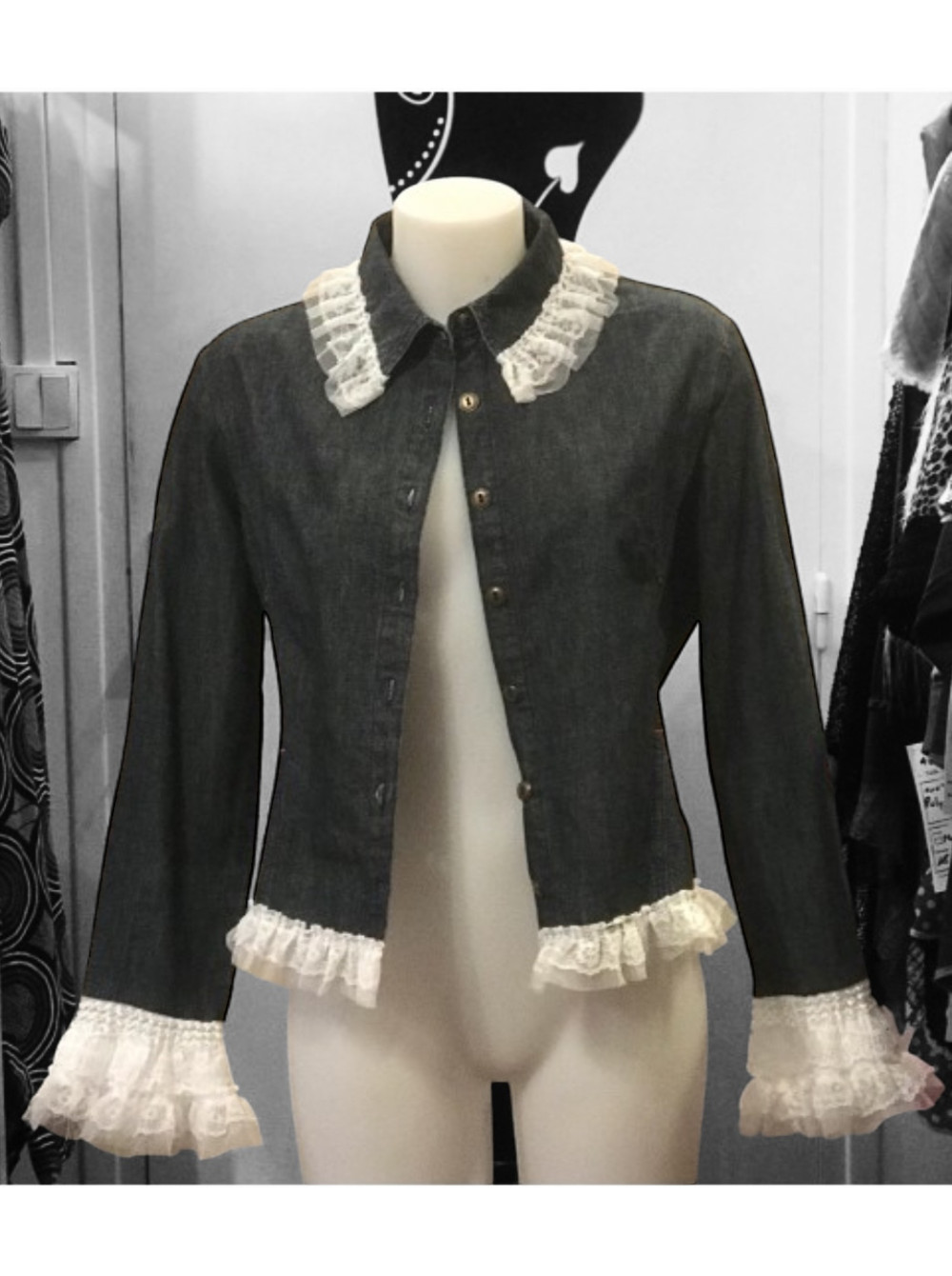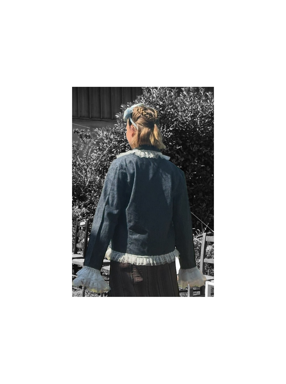 veste jeans bordée de dentelles blanches